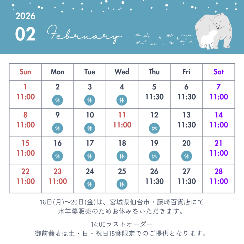 いつもご愛顧賜りまして、誠にありがとうございます。 2月の営業日程に変更がございましたので、改めて掲載させていただきます。 11日(水・祝)はそのまま営業致しますが、翌12日(木)は、水羊羹の製造のため振替休日とさせていただきます。